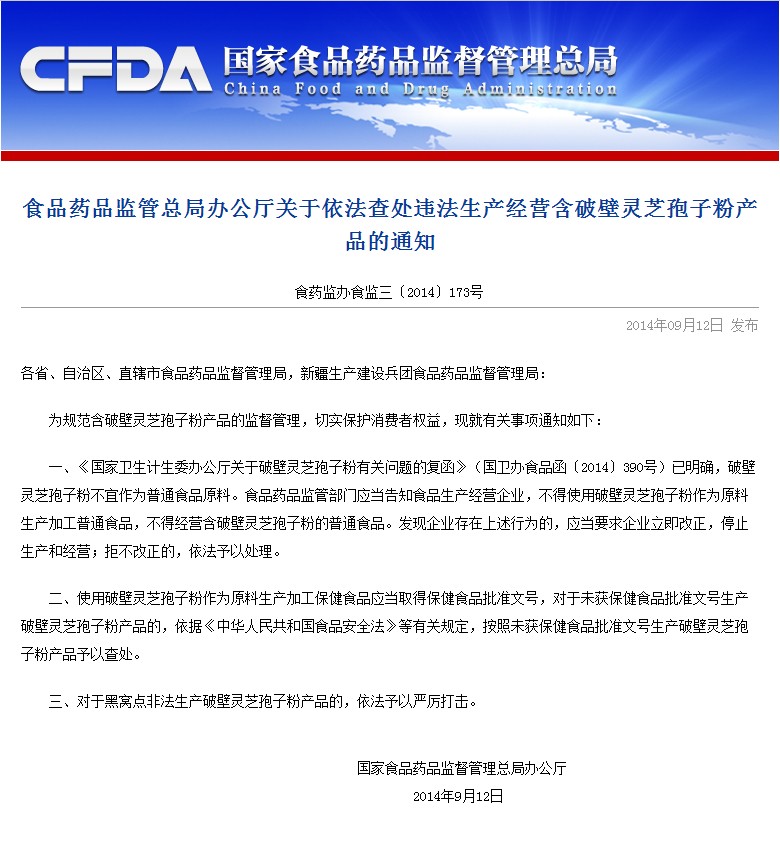 根據(jù)國家食品藥品監(jiān)督局發(fā)文要求,破壁靈芝孢子粉將不再允許作為藥食兩用菌來生產(chǎn)和銷售,保健食品必須要求保健品GMP企業(yè)生產(chǎn),我司為配合國家食品藥品監(jiān)督局工作與上海萊輝生物制品有限公司擁有的康強牌破壁靈芝孢子粉顆粒(國食健字G20050516)簽訂銷售合同。產(chǎn)品委托原保健品GMP企業(yè)(上??祻娚锟萍加邢薰荆┘庸て票冢ㄔa(chǎn)品加工證號與保健批文產(chǎn)品證號相同),上海菇新食品有限公司作為原料商及銷售商。